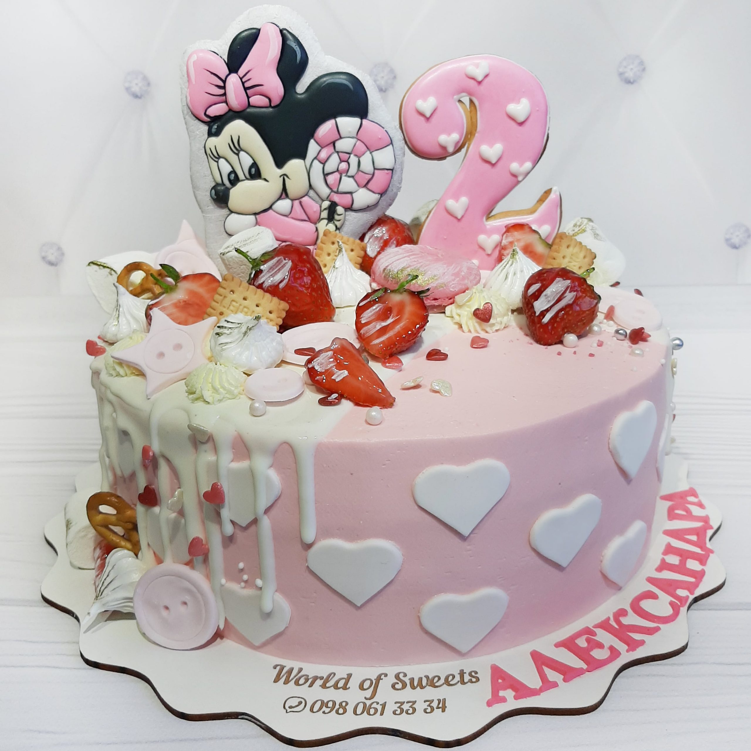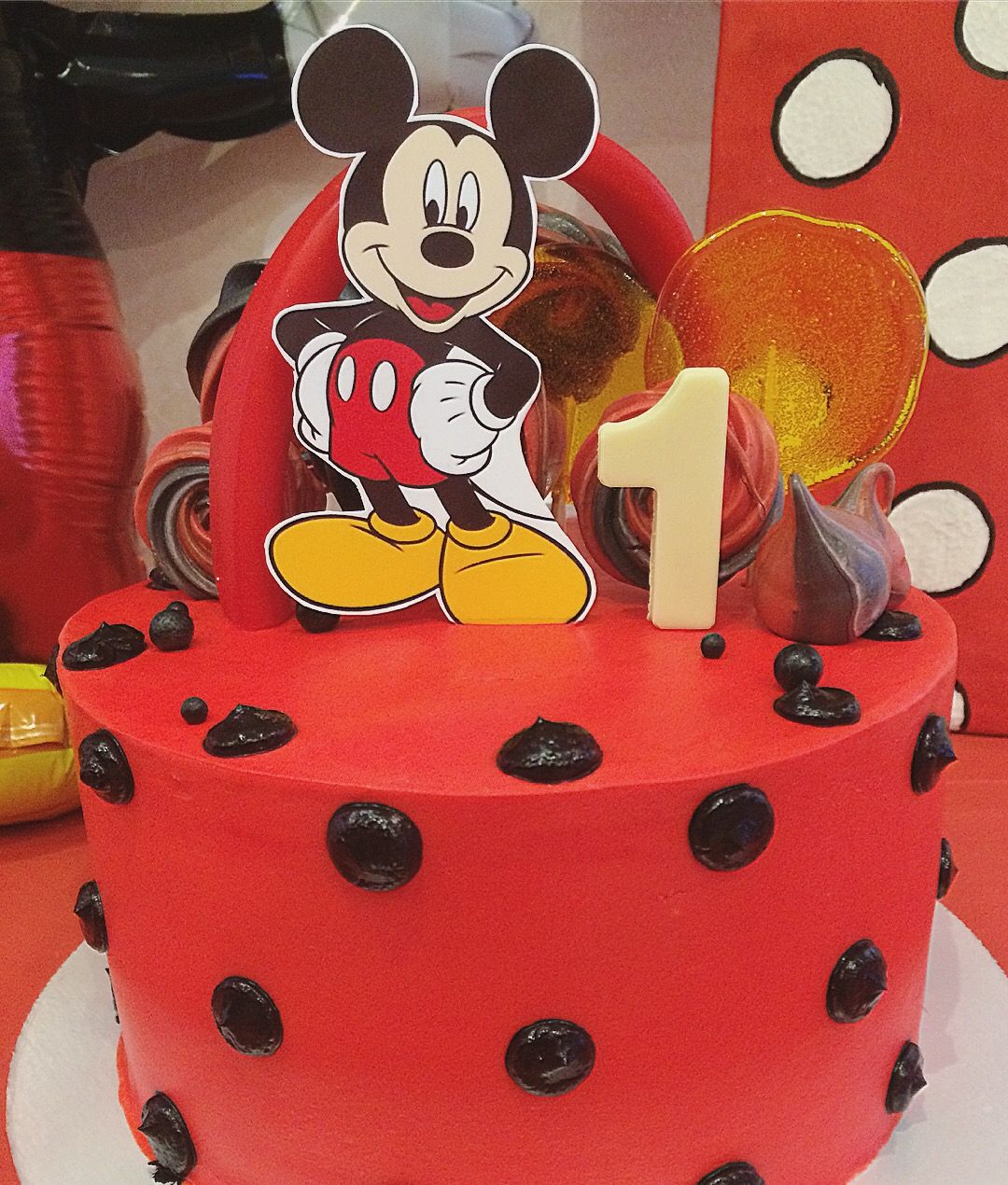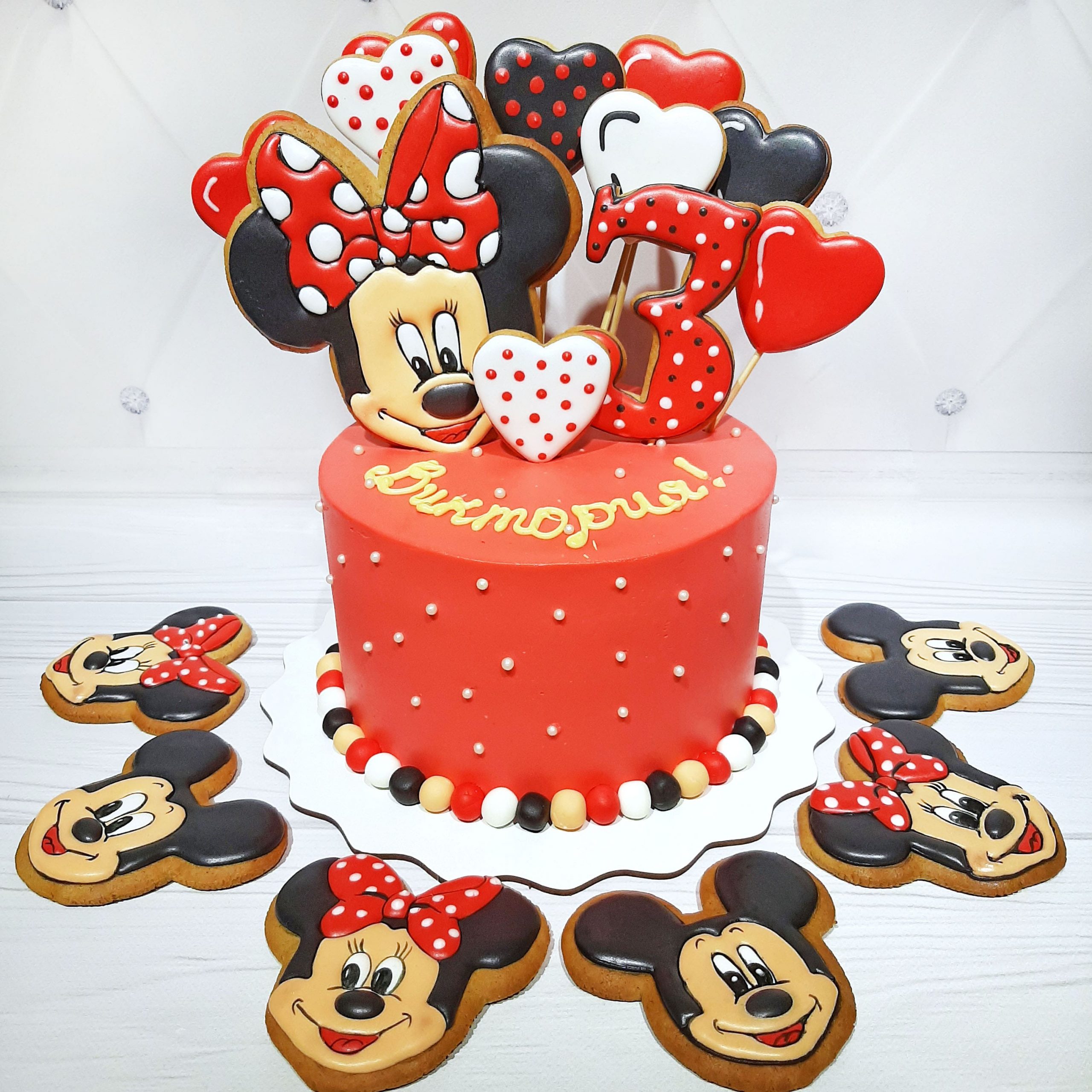 По традиции торт с Микки Маусом украшается символическими сердечками, ленточками, диснеевскими звёздочками, медово-имбирными пряниками с цифрами или силуэтом мордочки героя. Мы также добавим любую надпись к торту, дополним дизайн фигуркой из мастики. Мышонок Микки или его кокетливая подружка, может застенчиво стоять на торте, сжимая в лапках несколько воздушных шаров.