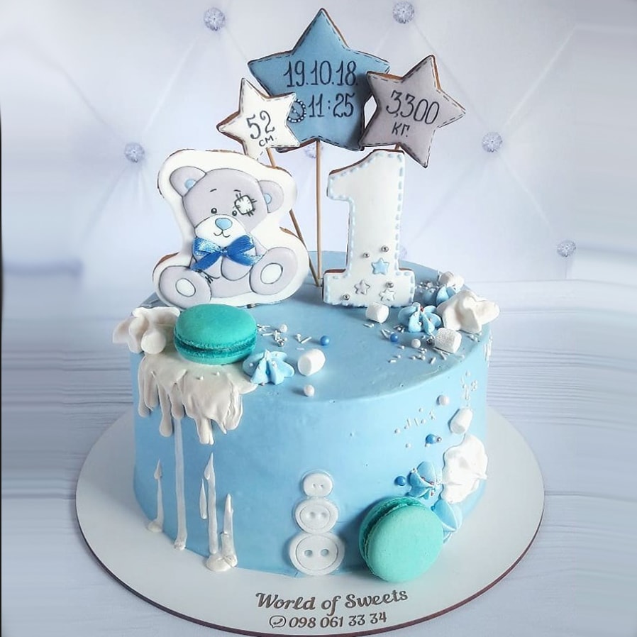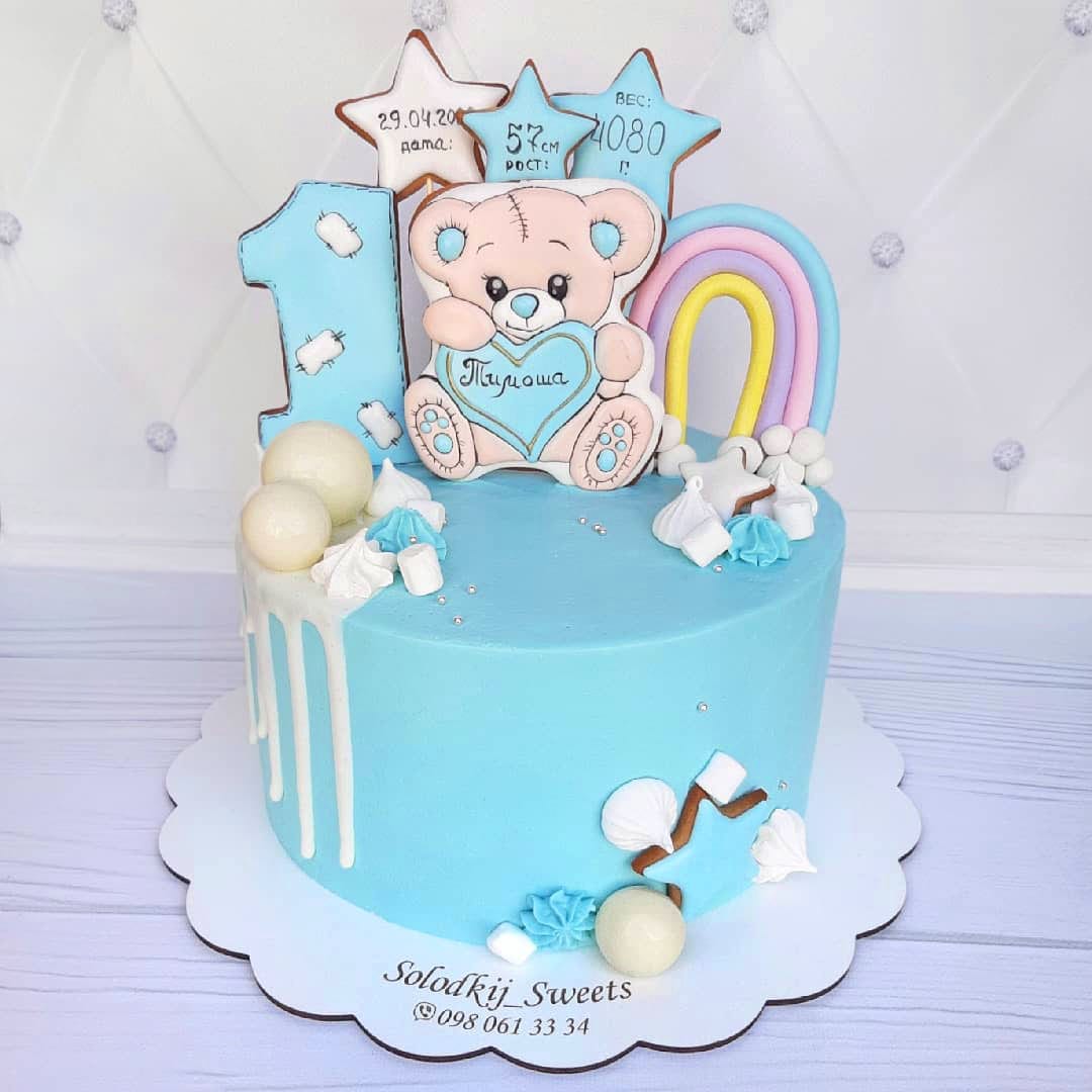 Заказать торт с пряниками на год, для самого маленького члена семьи. В состав торта входит любая начинка из нашего каталога. Выбрать более подходящий вариант по вкус, можно здесь. Композиция из имбирных пряников на торте, может меняться в зависимости от пожеланий заказчика. Цвет торта, также не стандартен, изменяется в зависимости от пола ребёнка и предпочтений родителей.