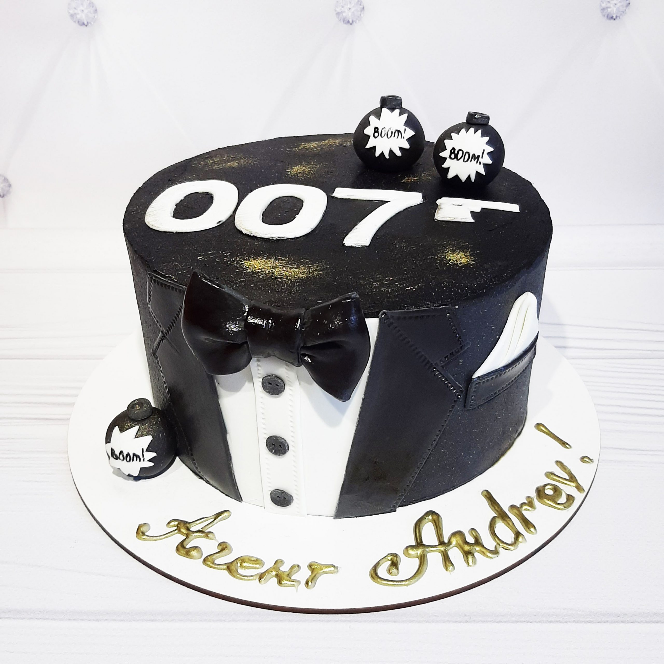 Купить торт агент 007 в подарок любимому «шпиону», маленькому сыну или взрослому мужу. Торт в стиле агент 007, покрыт мастикой с элементами декора. Украшения десерта, может дополнять фотопечать или расписные имбирные пряники, в виде пистолета, бомбочек, и секретного оружия.