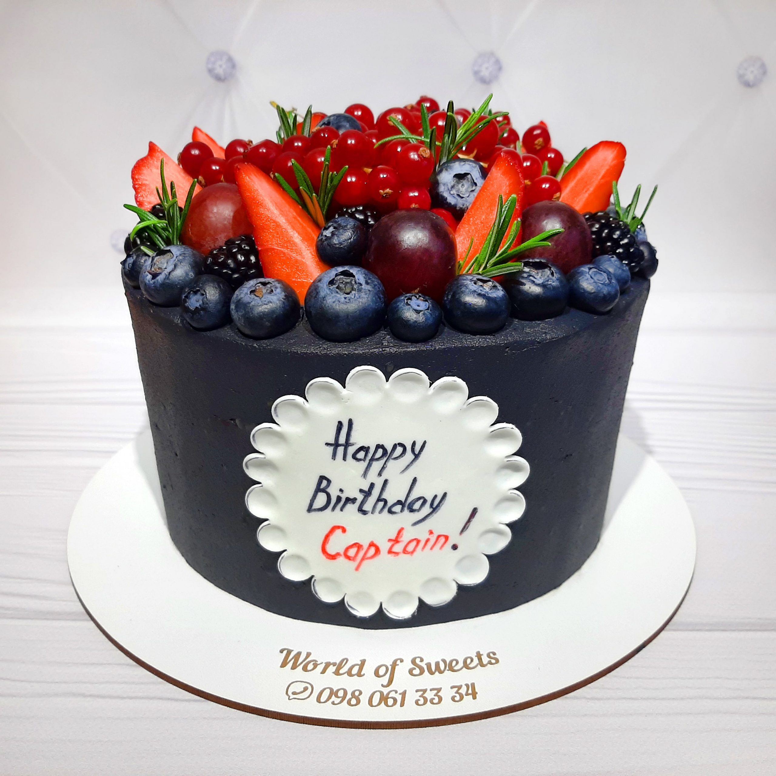 Черный торт с надписью содержащей имя именинника, первая экспозиция без надписи, просто черный торт с ягодами клубники, голубики, малины. Начинка данного десерта «Красный бархат» — Супер популярный классический рецепт родом с юга США с нежным насыщенно-красного цвета бисквитом с коньячной пропиткой и кремом на основе сливочного сыра «Кремалотье».