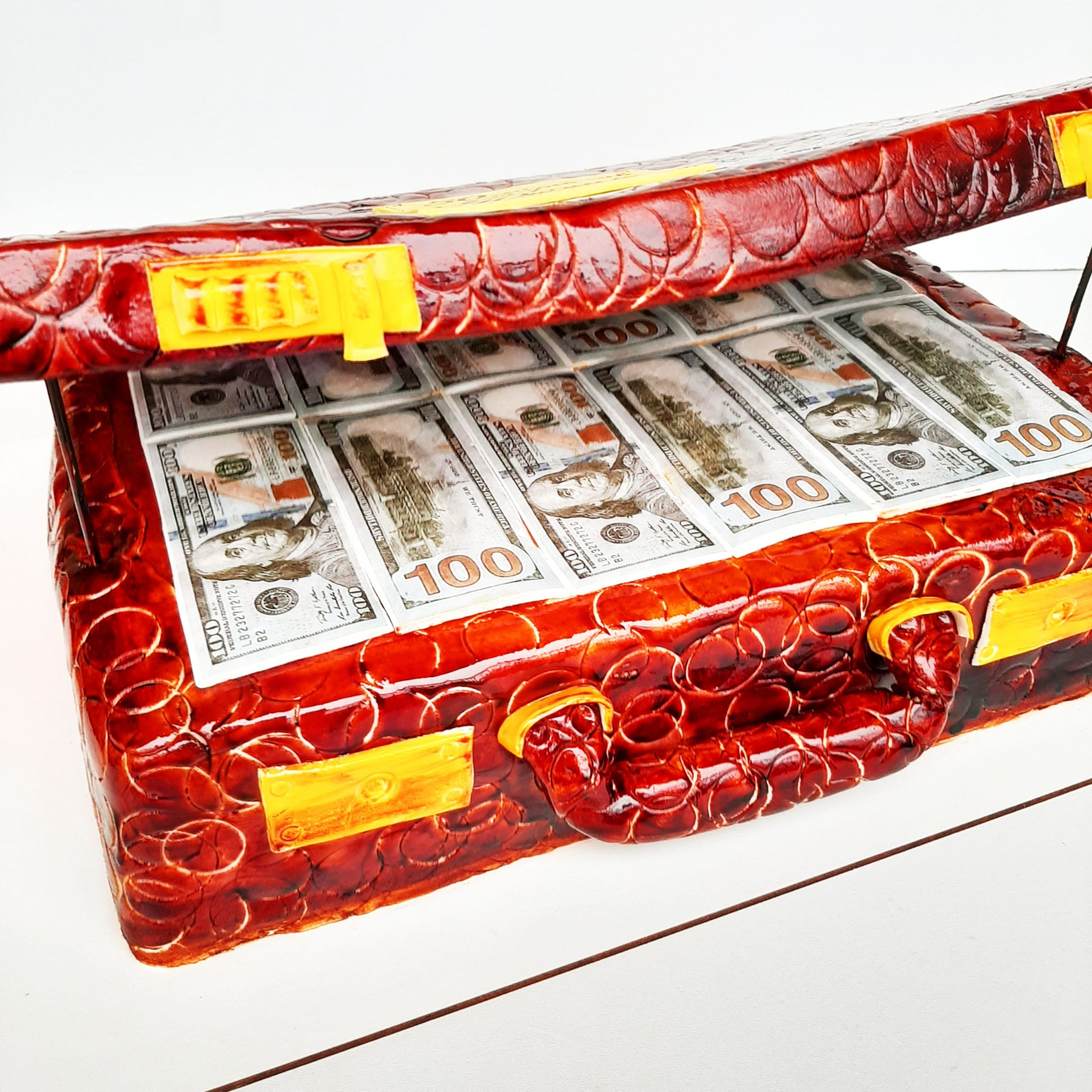 Основное покрытие торта, может быть из мастики или крема, выбор всегда остаётся за Вами. Торт в виде чемодана с деньгами, покрытый мастикой более практичен при перевозке. Кремовые торты в форме чемодана, более нежные, они требуют осторожного обращения. Такие десерты (кремовые), не любят долгих перевозок, и длительного времени без холодильной камеры!