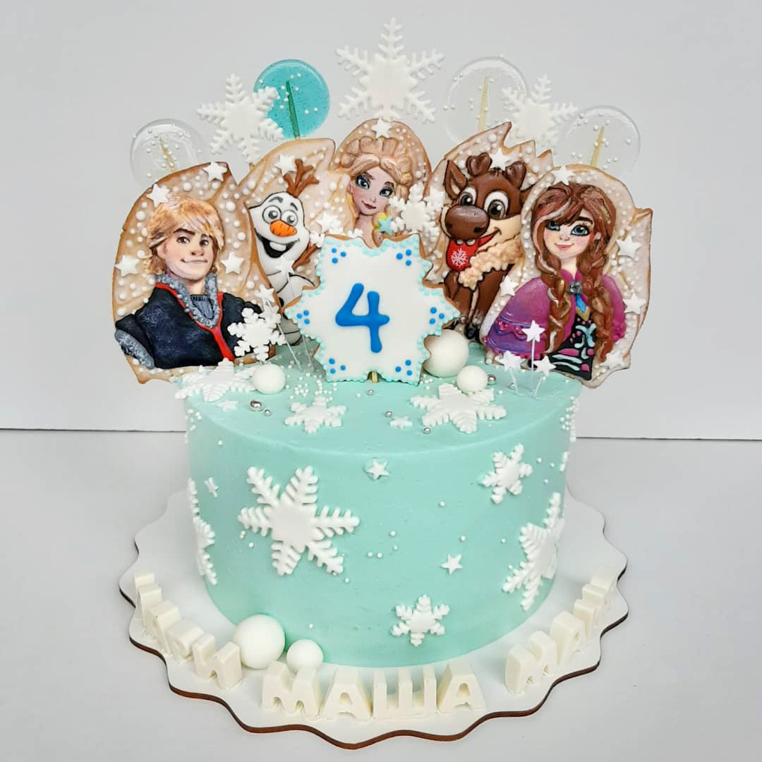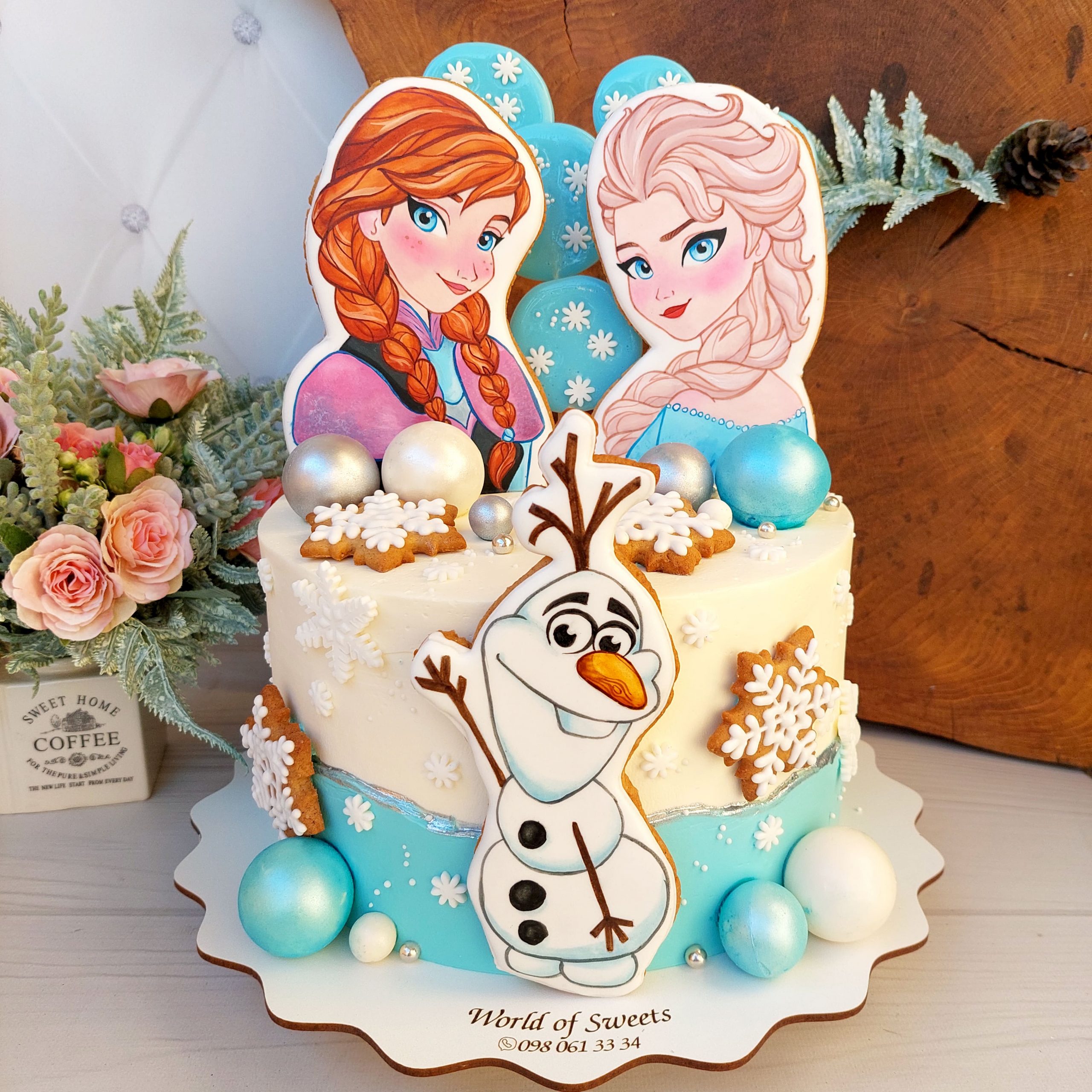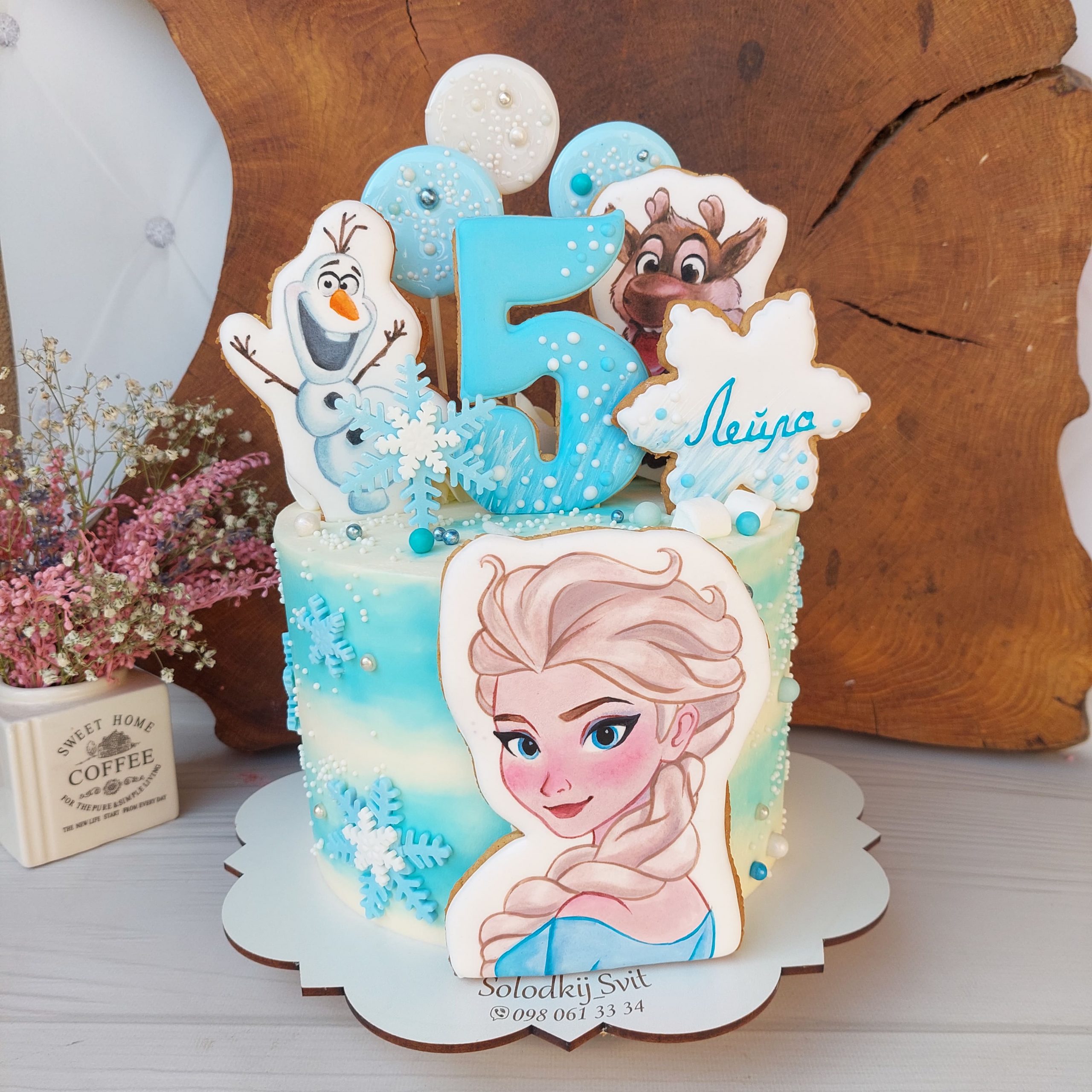 Торт холодное сердце фото которого найдете в нашем каталоге — это всегда новый и интересный дизайн. Украшен торт фигурками и расписными пряниками ручной работы. Все фигурки и печеньки съедобны.