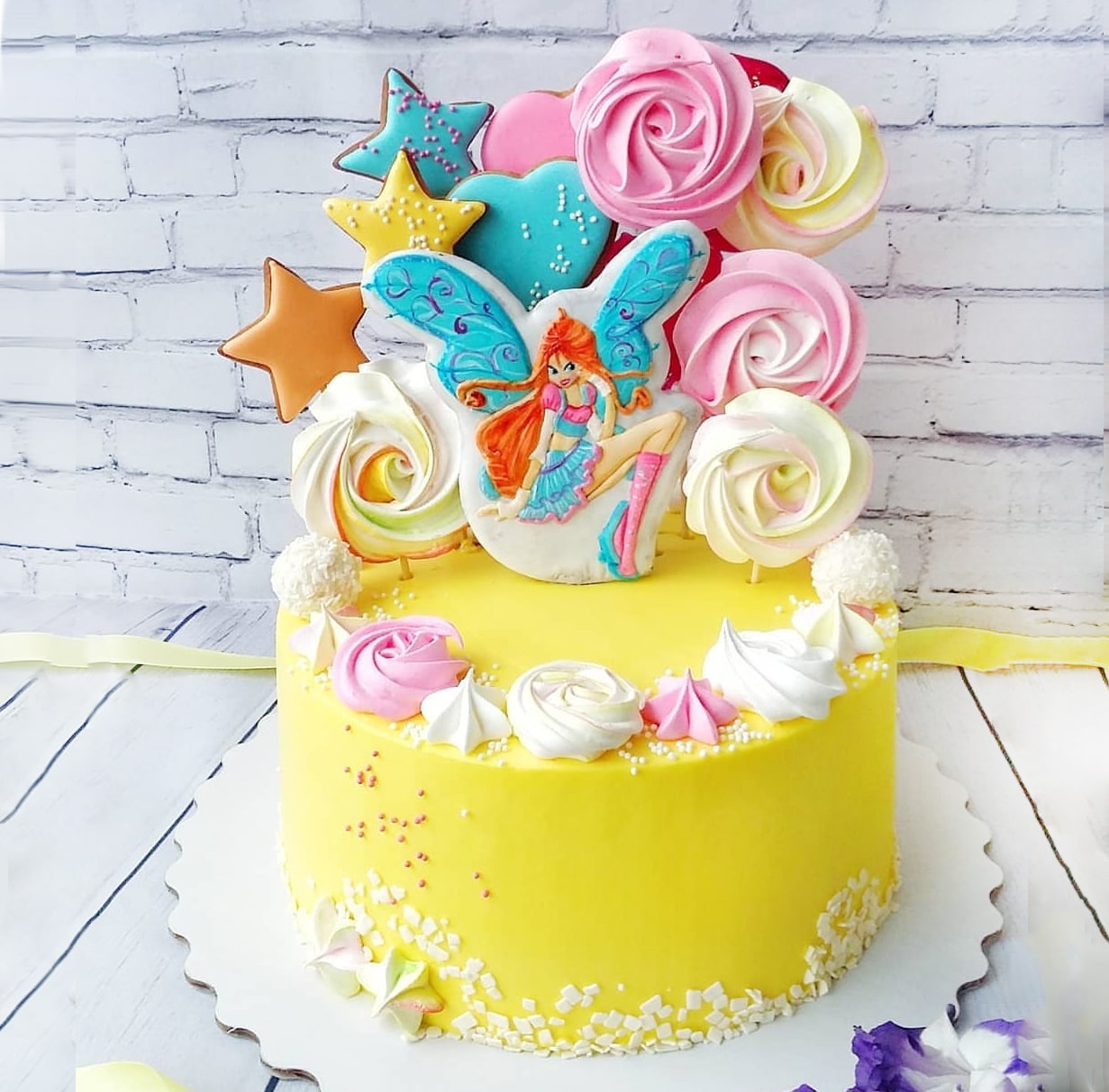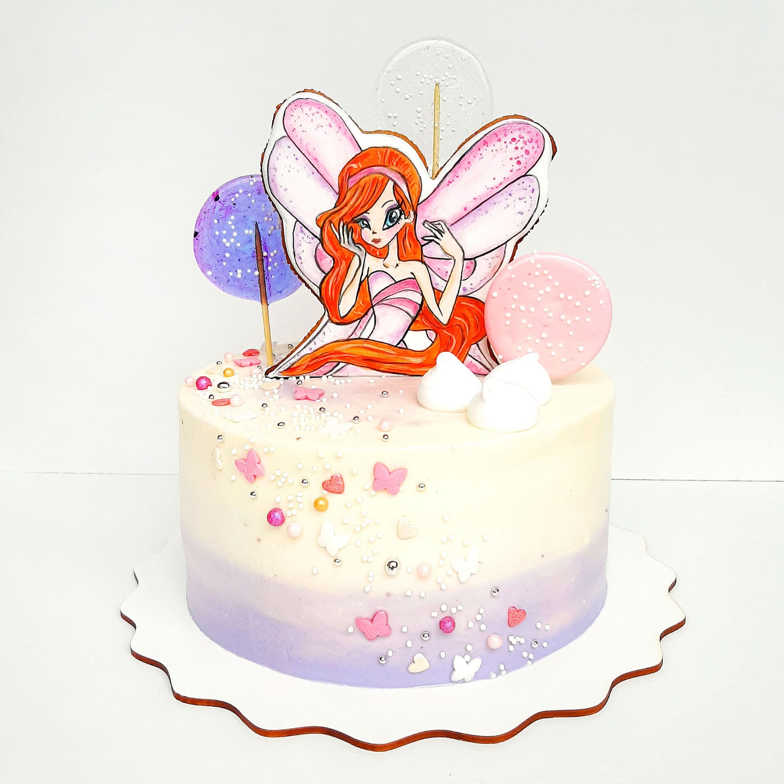 Торт Винкс фото которого найдете в нашем каталоге — это всегда новый и интересный дизайн. Украшен торт фигурками и расписными пряниками ручной работы. Все фигурки и печеньки съедобны.