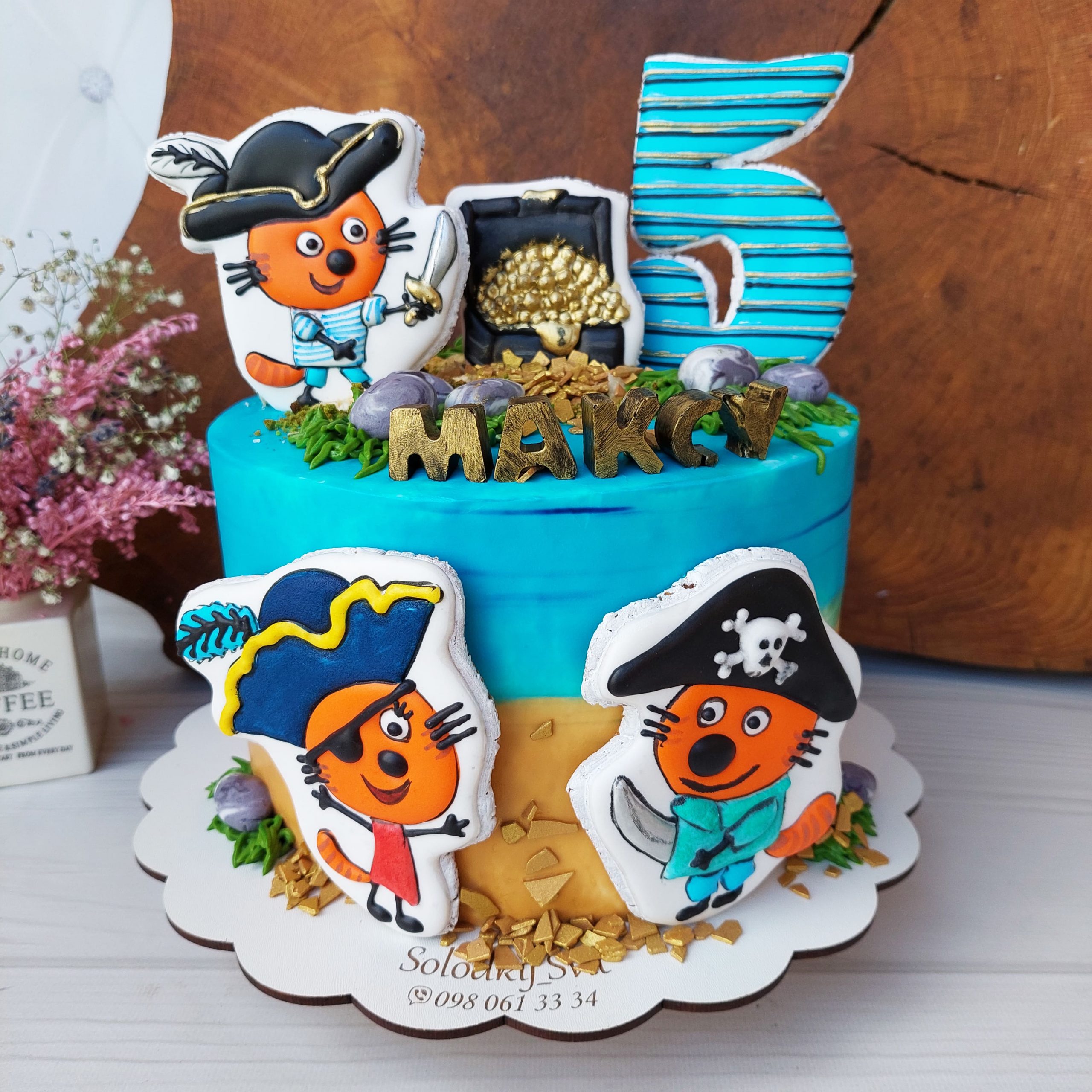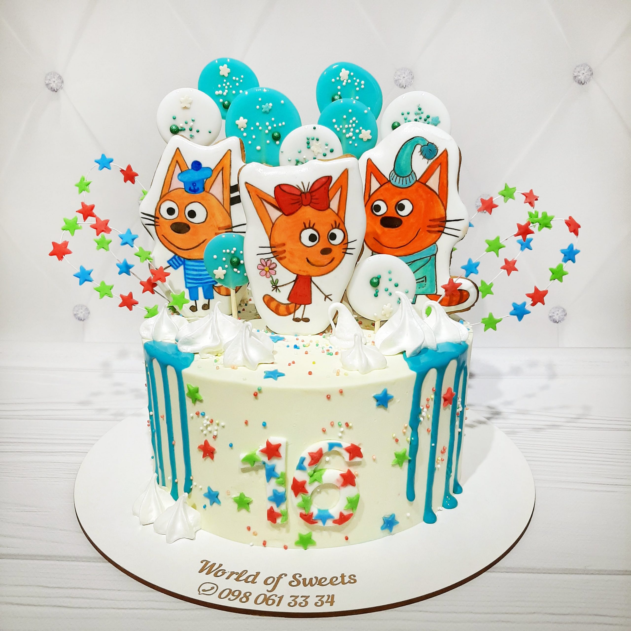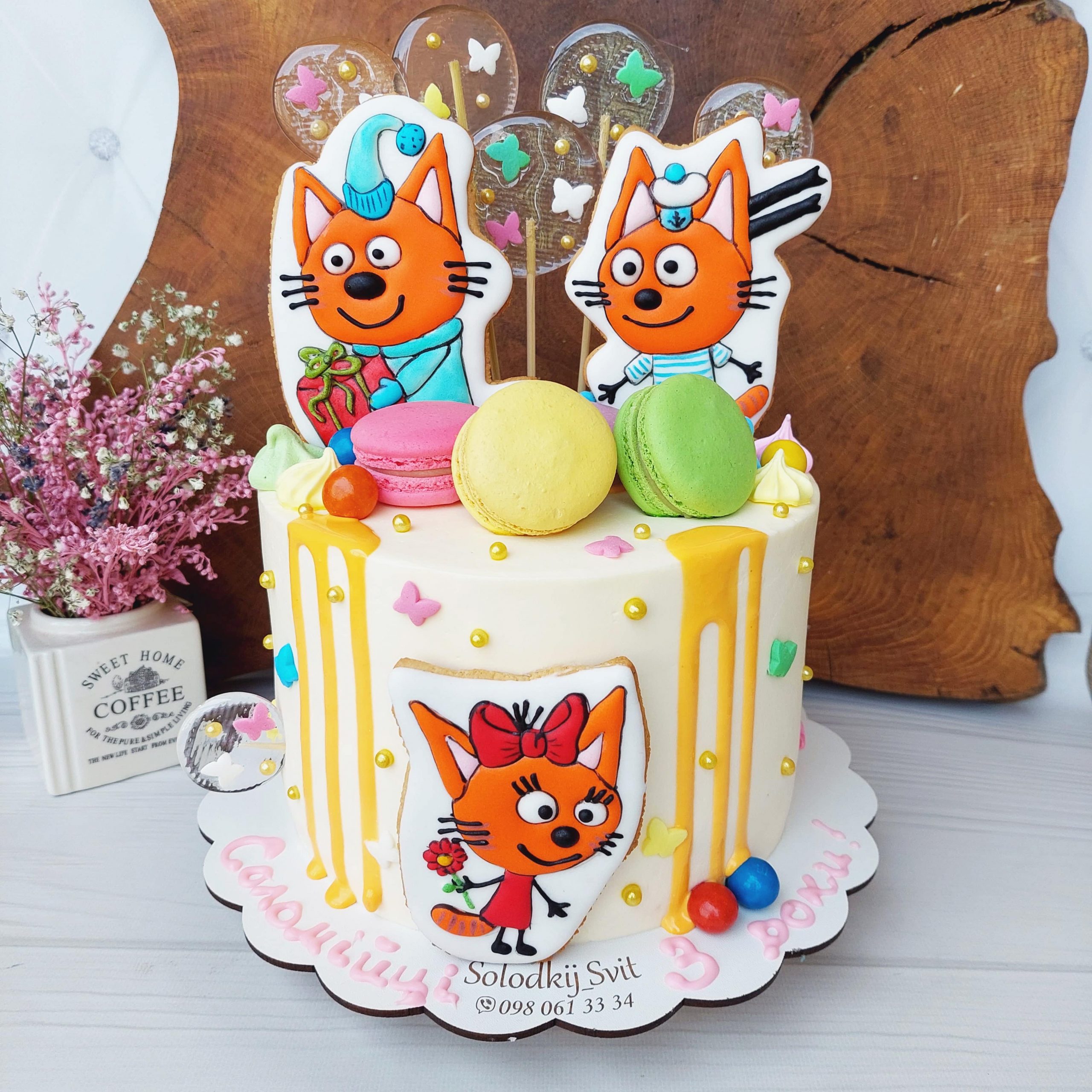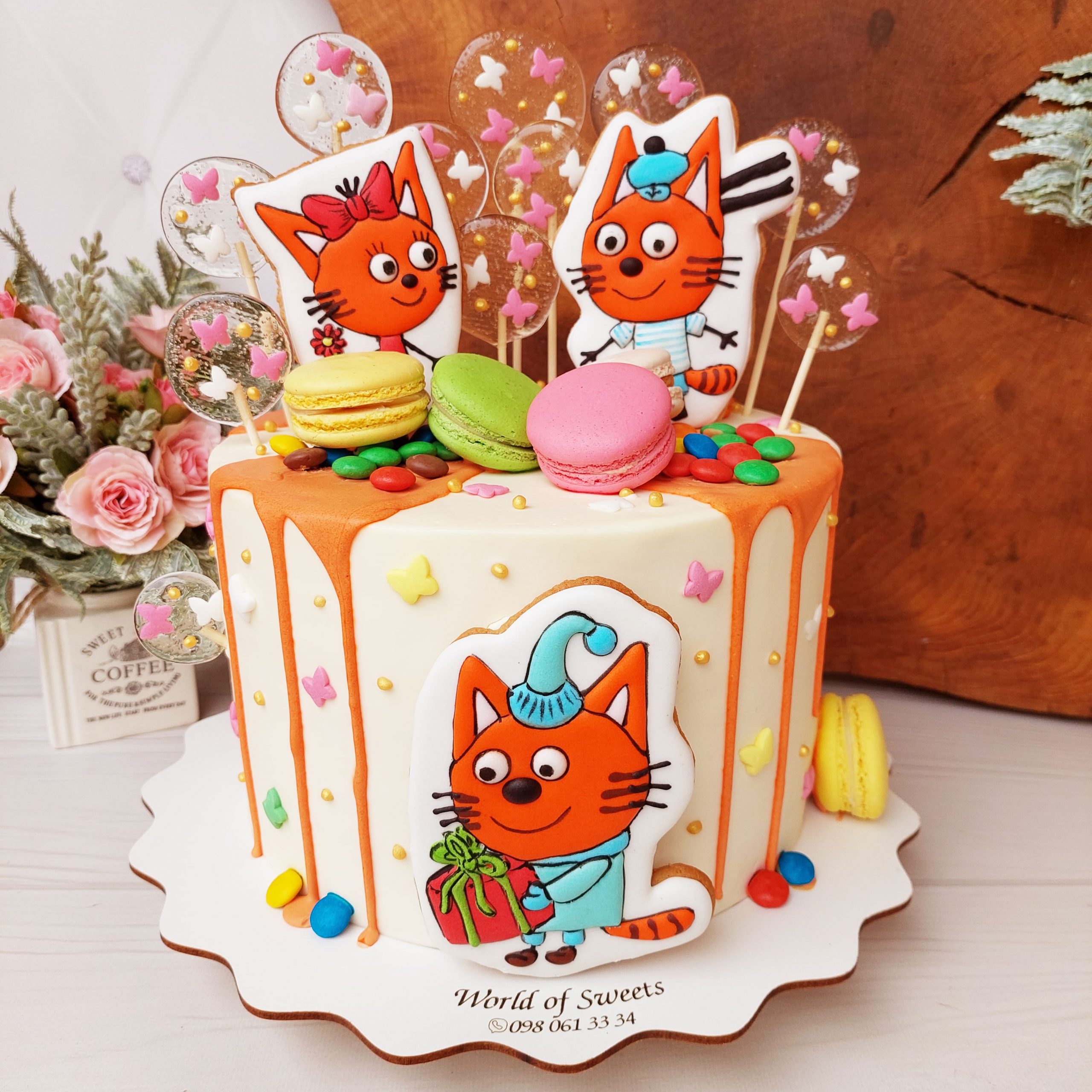 Торт Три кота, сделан по мультфильму «три кота». Ориентированный для детей дошкольного возраста. На экранах телевизора с 2015 года. Является аналогом британского мультсериала Свинка Пеппа.