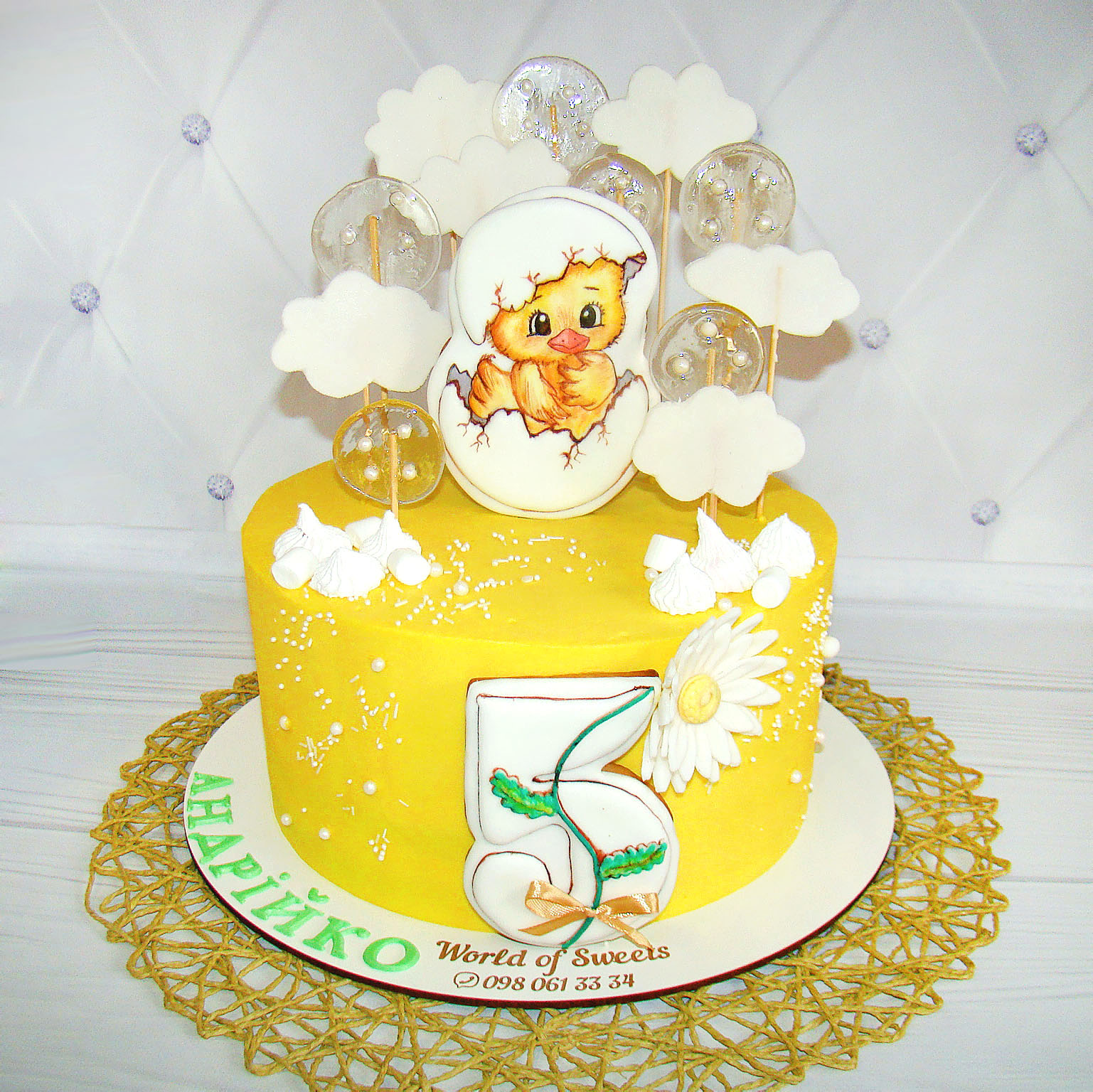 Замовити торт курча з нашого каталогу або по вашому фото та ескізу. Торт курча Флорик являє собою жовтеньке пташеня, з блакитними очима. Який тільки недавно вилупився з яйця і в нього на голові, шапочка зі шкаралупи. До того ж, курка, що недавно народилася на світ, вже встиг назбирати білих ромашок, які несе привітати такого ж малюка, Вашого малюка.