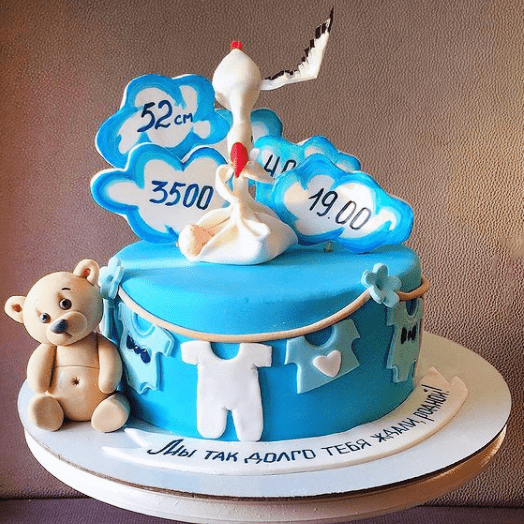 До складу святкового частування входять лише натуральні, свіжі продукти. Начинка для торта підійде будь-яка з нашого каталогу. Підібрати НАЧИНКУ. Торт на замовлення з лелекою, є справжнім кулінарним шедевром та гордістю нашої кондитерської. Сам тортик, прикрашений птахом та маленькими атрибутами малюка. У центрі торта, Лелека дбайливо несе в дзьобі пелюшку з новонародженим немовлям. З боків, десерт може бути оформлений різнокольоровими, маленькими штанцями та футболками, що висять на прищіпках. Все для маленького чоловічка! Зверху торт виконаний у спокійних світлих тонах, а бешкетні відтінки елементів оформлення подарують частинку радості та дитинства.