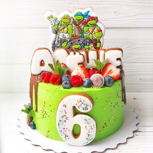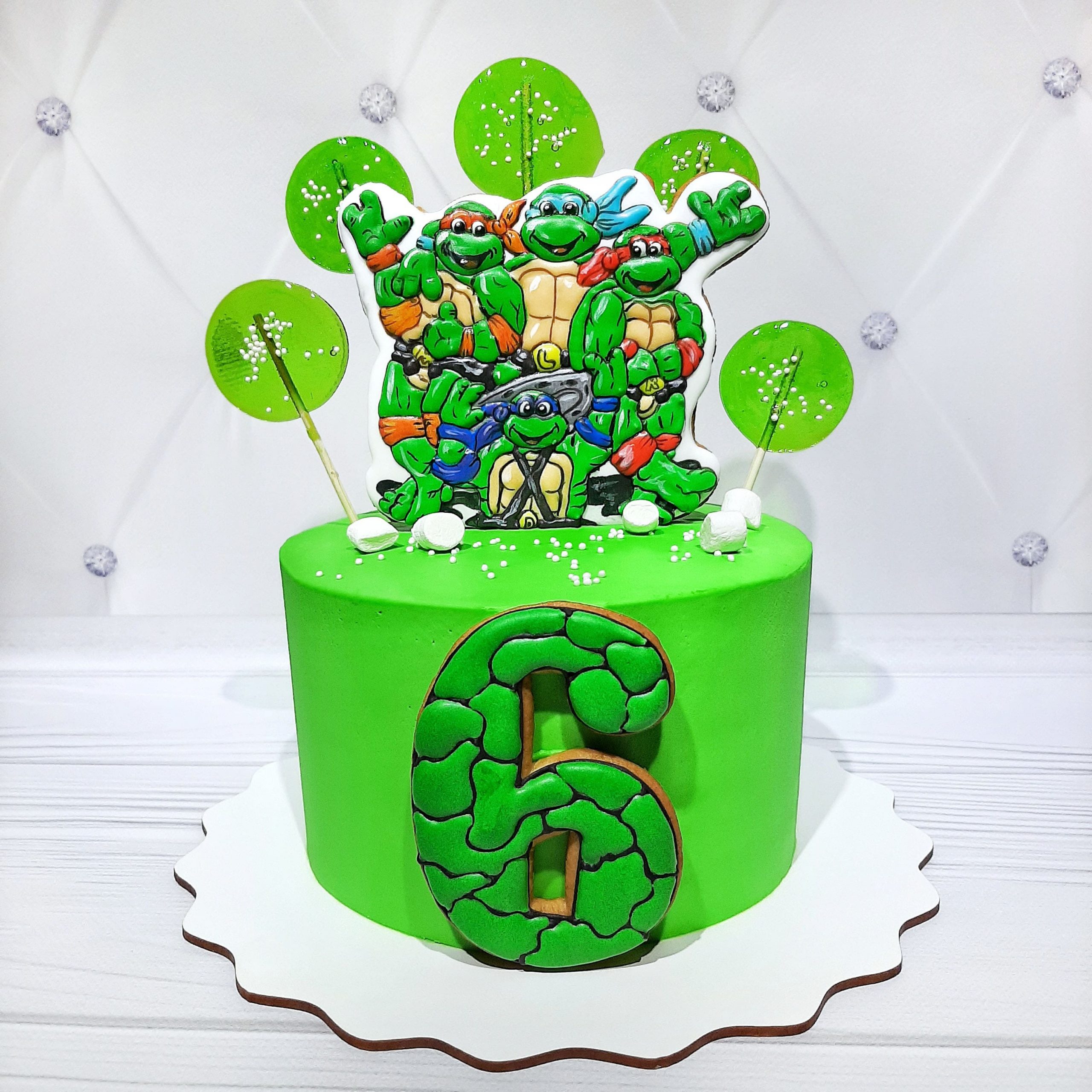 Торт черепашки ніндзя, який знайдете у нашому каталозі – це завжди новий та цікавий дизайн. Прикрашений торт розписними пряниками ручної роботи та фігурками з мастики. Весь декор їстівний.